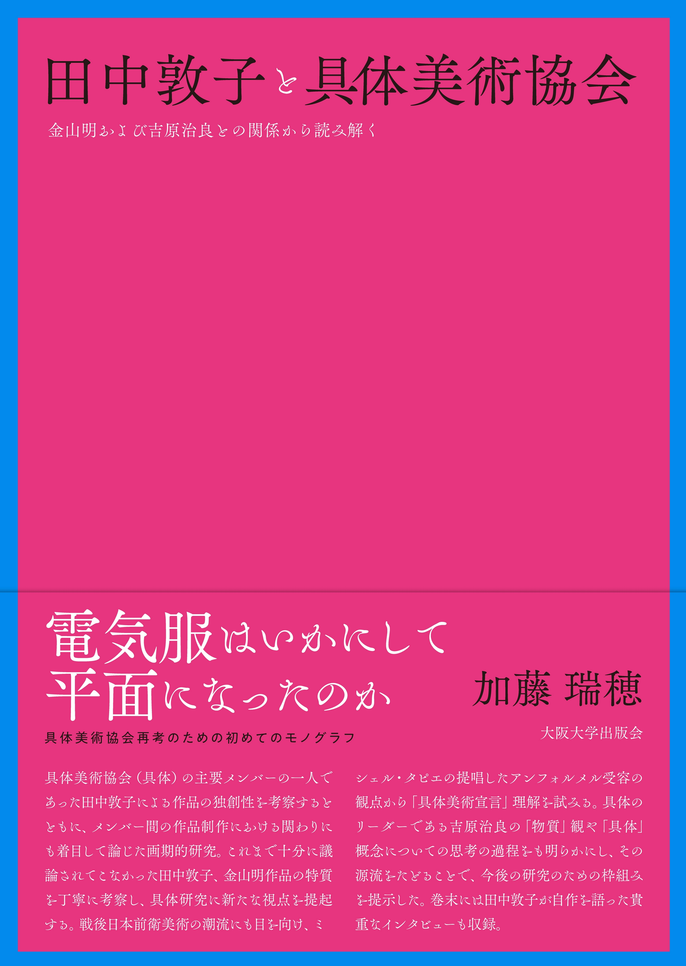 「代表作《電気服》などを制作した田中の独創性を、具体のリーダーであった吉原治良、具体メンバーでのちにパートナーとなる金山明という二人の作家との関わりから論じる画期的な1冊」